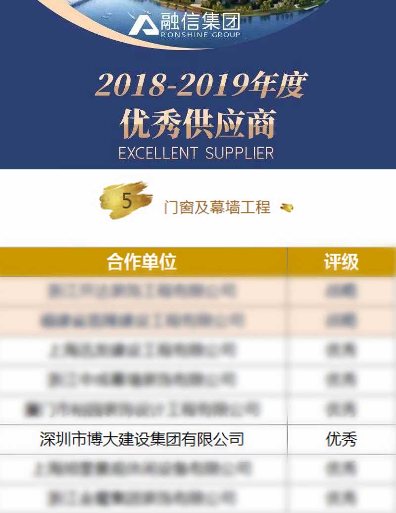 博大建設集團在2018-2019年度成績突出,榮獲融信集團頒發(fā)的門窗及幕墻工程“優(yōu)秀供應商”稱號。融信集團創(chuàng)立于2003年,總部位于上海,是中國房企20強。