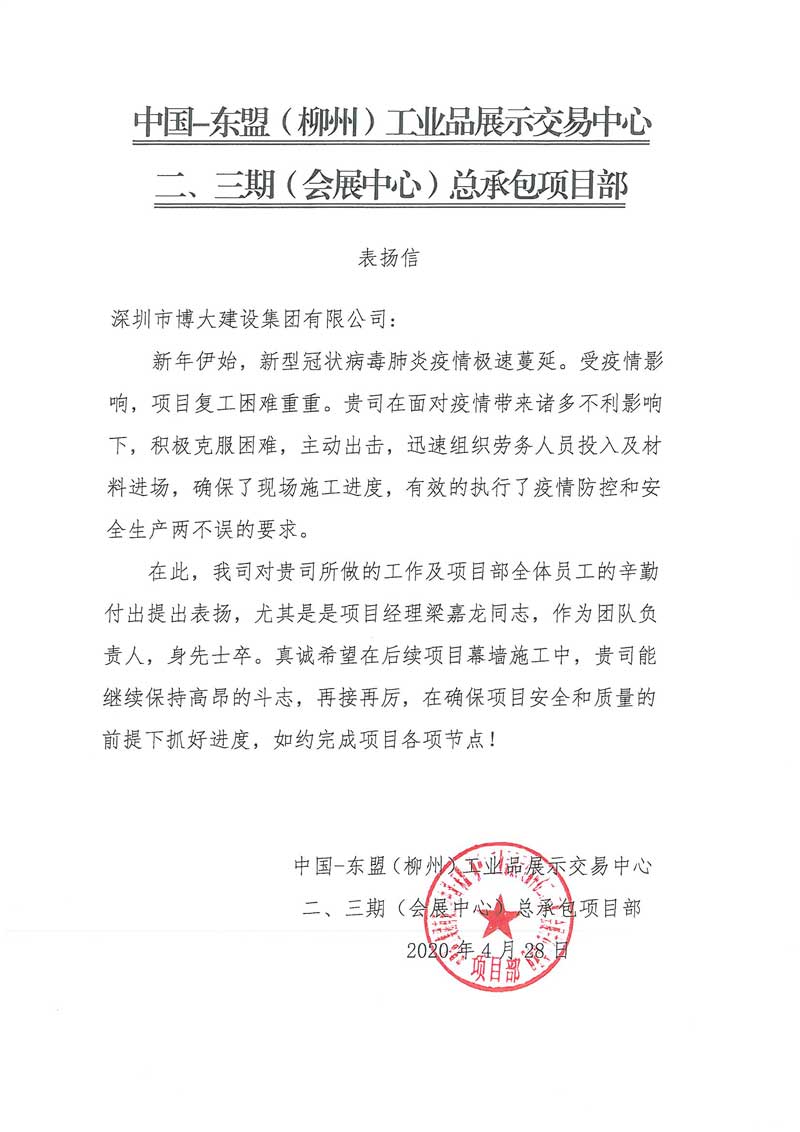 博大建設集團在中國-東盟(柳州)工業(yè)品展示交易中心二、三期(會展中心)項目中,積極克服疫情造成的困難,主動出擊,確保了現場施工進度,有效的執(zhí)行了疫情防控和安全生產兩不誤的要求,獲得客戶表揚。