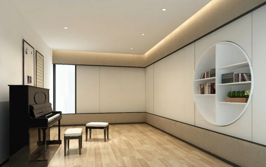 琴房的設計上,墻面采用一些卡其色的亞麻質感的壁布,烘托一下整體空間的氛圍,讓空間光影的色性上更加柔和,墻上如畫卷展開的造型,體現整體空間的人文特質。